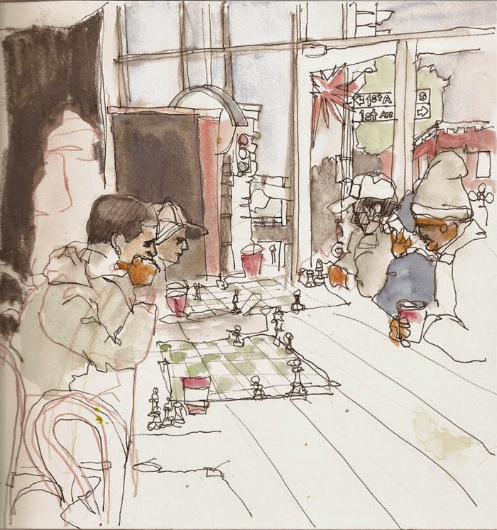 Fortunately, I had been sitting just outside a Starbucks. As I entered I saw at least 5 other urban sketchers. And there was a couple of intense chess games on one of the long tables. I think these guys meet there regularly. They were really into it. Made me think of Washington Park in New York.
