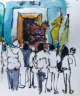 It's interesting to me how my style changes with different pens and paper combinations. The first were drawn with my Lamy pen on Shizen paper that's very absorbent and slows me way down. The lion dances were done with my Sailor bent nib on an unknown brand, but really nice watercolor paper. It was the first time I used my Sailor with the ink cartridge that shipped with it. Turns out it isn't waterproof, but adds a really different fluidity.